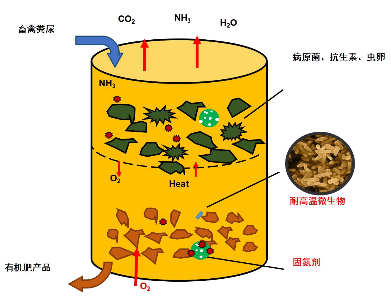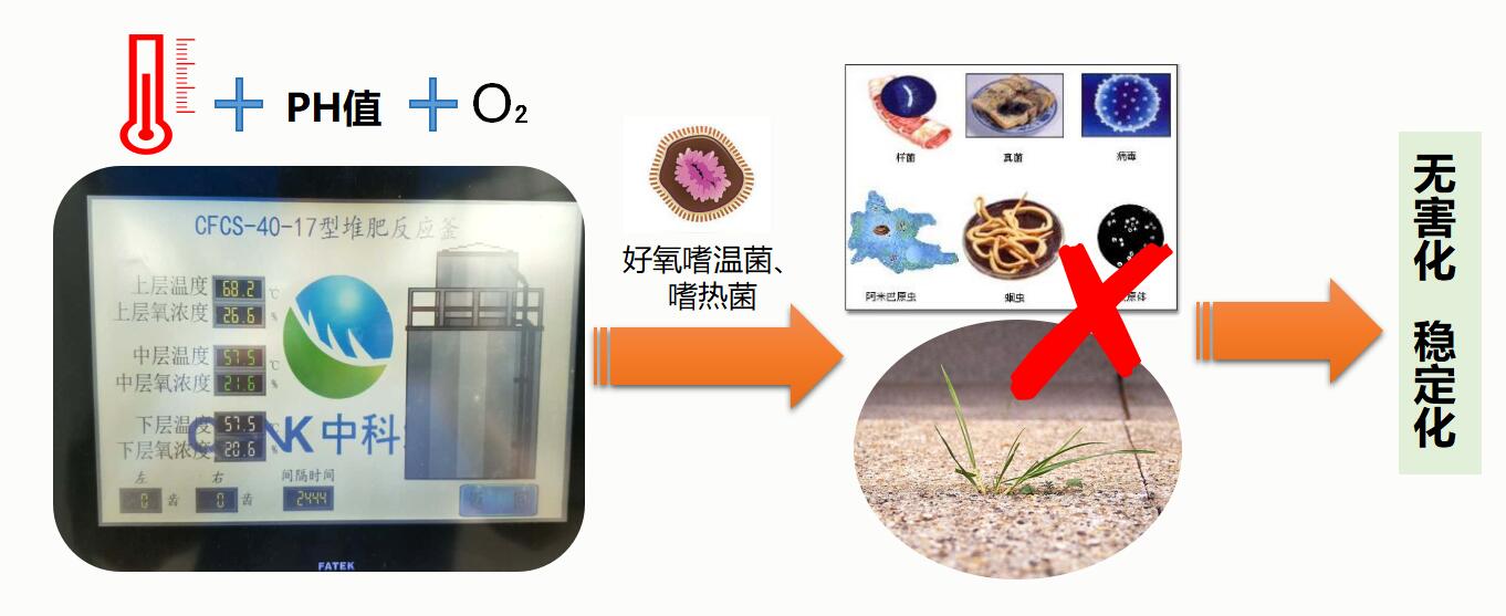 好氧堆肥发酵过程是一个微生物学处理过程,在一定温度和PH值下,供氧通风,利用好氧嗜温菌和嗜热菌对其中有机物进行生化分解,降解成稳定腐殖质。同时,利用发酵过程中产生的温度(一般达55-60℃,最高温度可达70℃)杀死病原微生物、寄生虫和杂草种子,以达到无害化处理指标。